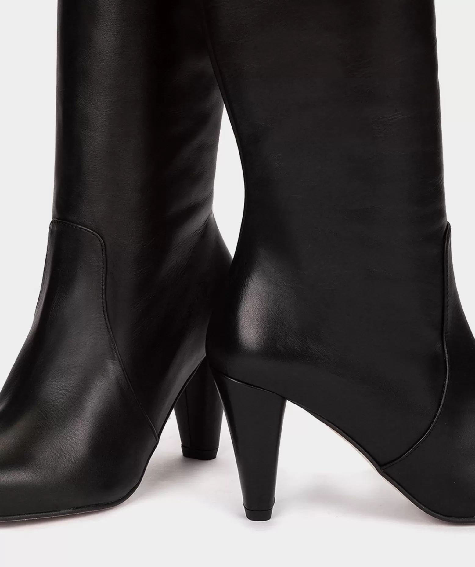 Bottes À Talons Hauts En Cuir Noir. Le Talon Du Modèle Almadén Se Distingue Par Son Design, A Une Base Plus Large Sur Le Dessus Qui Se Rétrécit Vers Le Bas, Créant Une Forme Conique Élégante Et Stylisée. Si Vous Voulez Un Basique Dans Votre Garde-Robe, Choisissez Ces Bottes Et Ajoutez Une Touche D’Originalité Et De Modernité À Vos Looks.