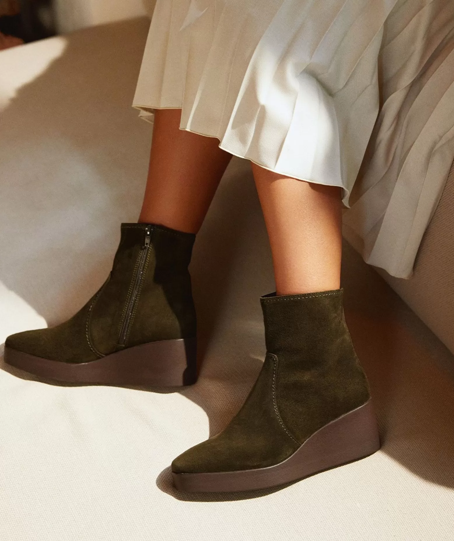 Bottines À Semelle Compensée Et Plateforme En Croûte De Cuir Verte. Lorsque Vous Enfilez Ces Bottines, Vous Ressentez Le Confort Et L’Assurance Que Procurent La Semelle Compensée Et La Plateforme. Chaque Pas Que Vous Ferez Sera Plus Léger Et Plus Sûr De Vous, Tout En Vous Sentant Élégante Et En Pleine Possession De Vos Moyens.