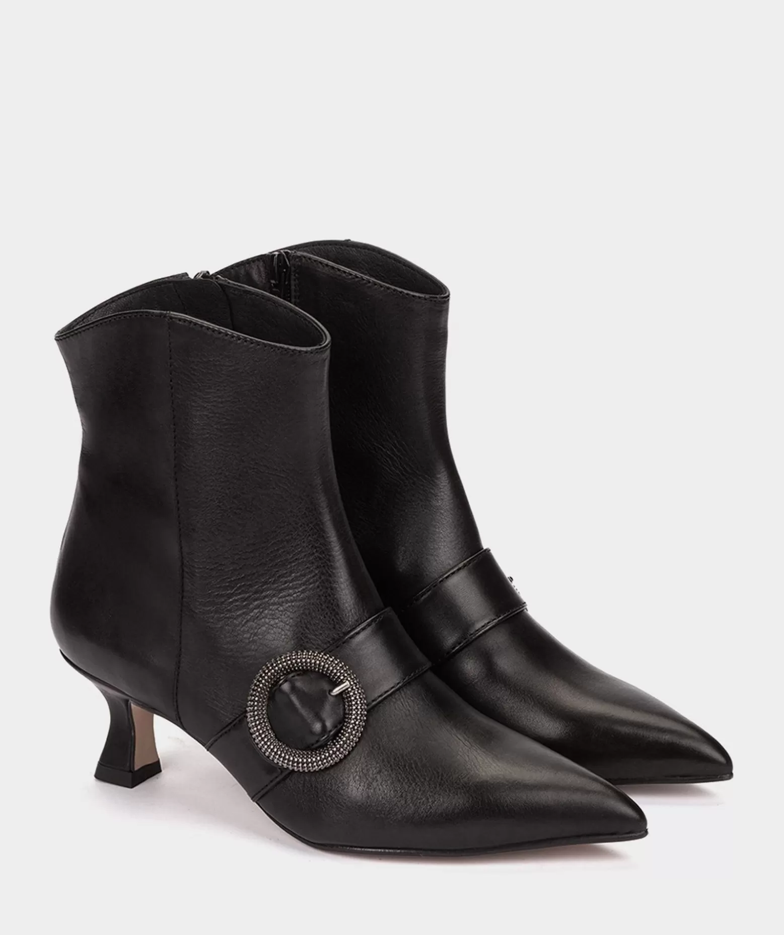 Bottines À Talons Hauts En Cuir Noir. La Forme Allongée Et Aérodynamique Crée Une Silhouette Élégante Et Chic, Qui Met En Valeur L’Élégance De La Personne Qui La Porte. La Boucle Stratégiquement Placée Sur Le Cou-De-Pied Crée Un Point Focal Frappant Qui Attire L’Attention Sur Le Centre De La Chaussure.