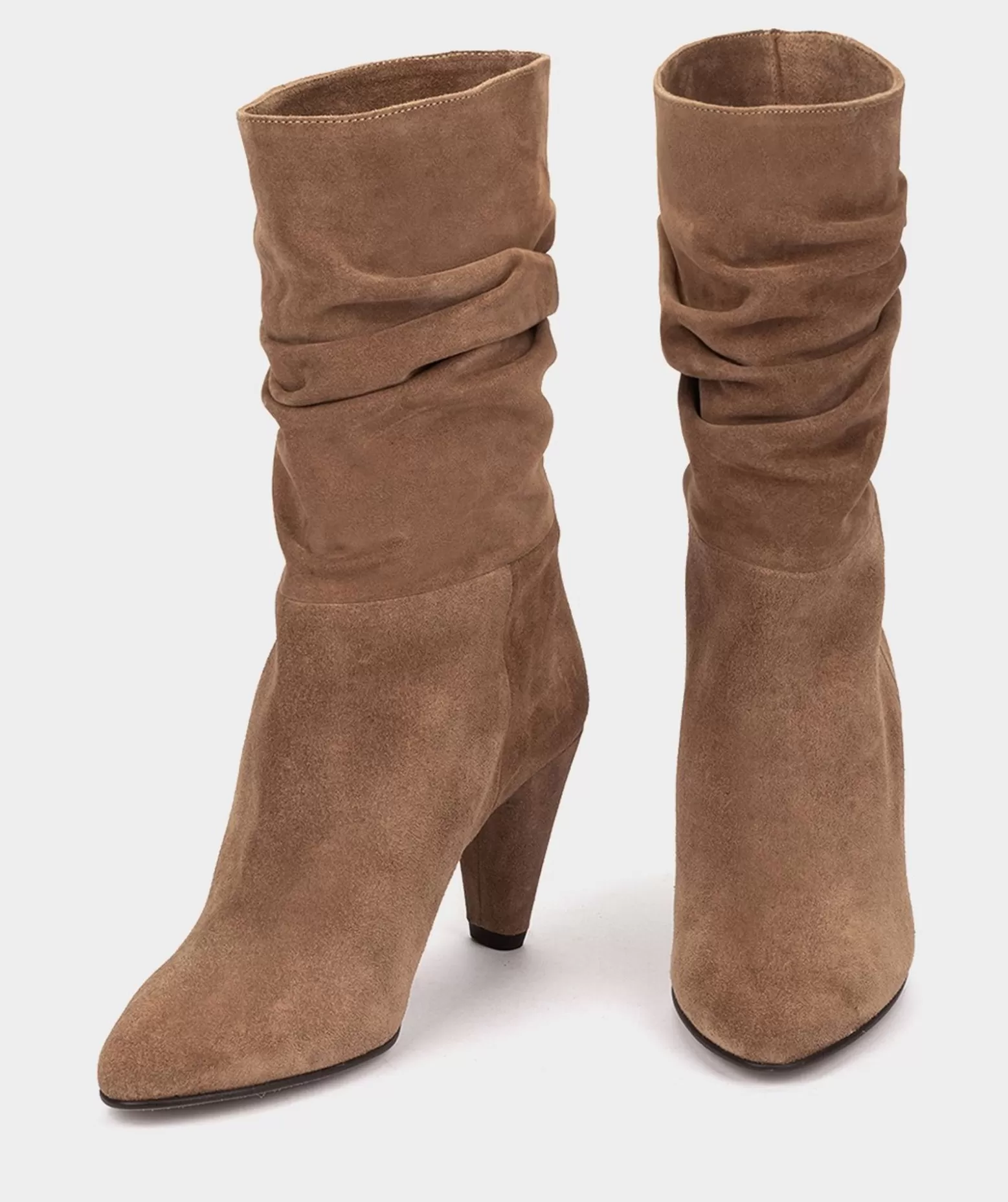 Bottes À Talons Demi-Ronds En Cuir Noir. Le Modèle Los Angeles A Été Construit Avec Une Tige Légèrement Froncée Qui Ajoute Une Finition Et Une Personnalité Innovantes Au Design. Le Talon A Une Base Plus Large En Haut Qui Se Rétrécit Vers Le Bas, Créant Une Forme Conique Élégante Et Mince.