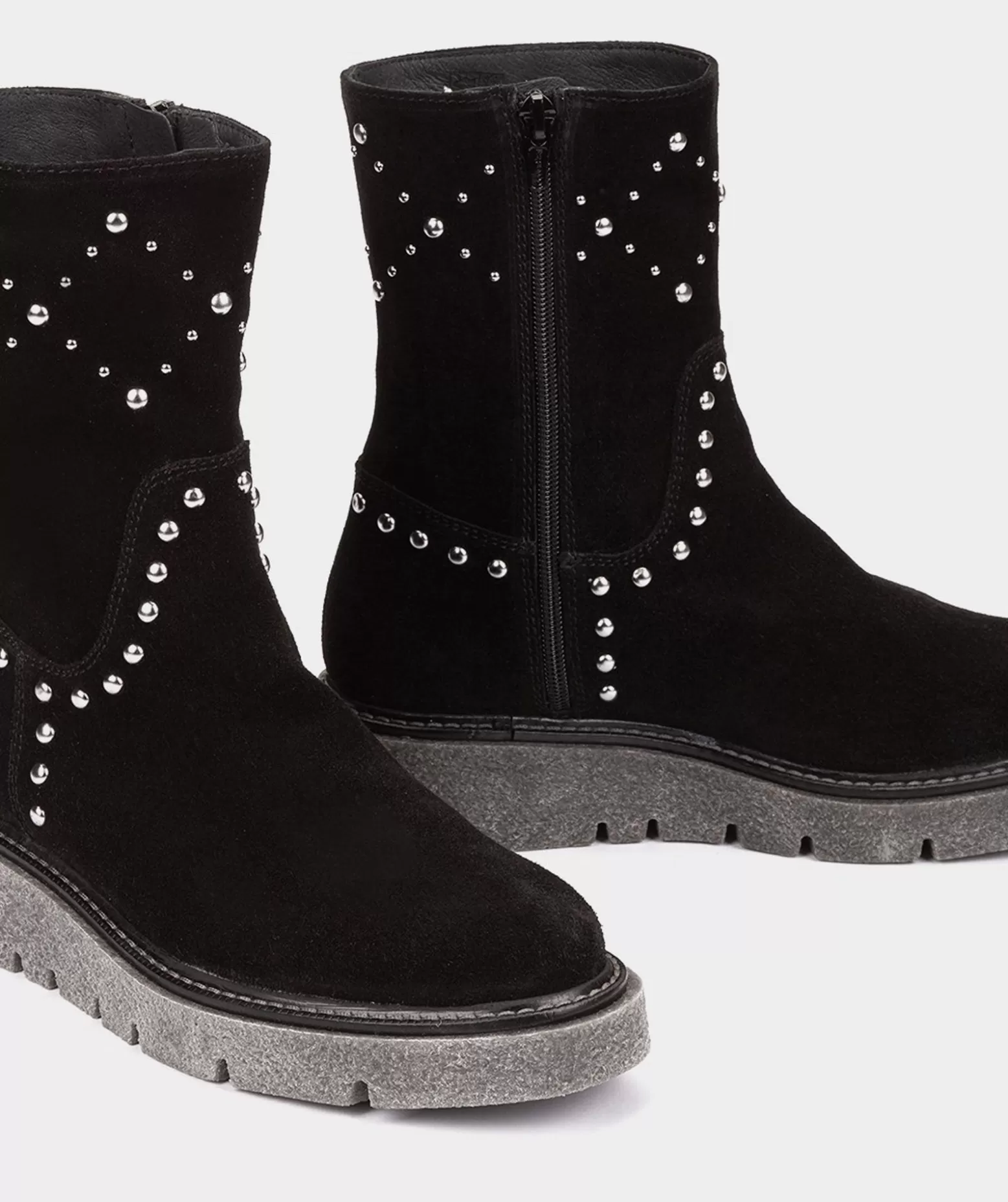 Bottines En Daim Noir. La Particularité Des Bottines Jijona Sont Les Clous De Différentes Tailles Qui Créent Un Contraste Saisissant Avec Le Daim. La Semelle En Crêpe Est Un Autre Détail Qui Fait La Différence Dans Ces Bottines. Son Aspect Rugueux Et Texturé Offre Une Prise En Main Sûre Et Un Confort Exceptionnel Lors De La Marche.