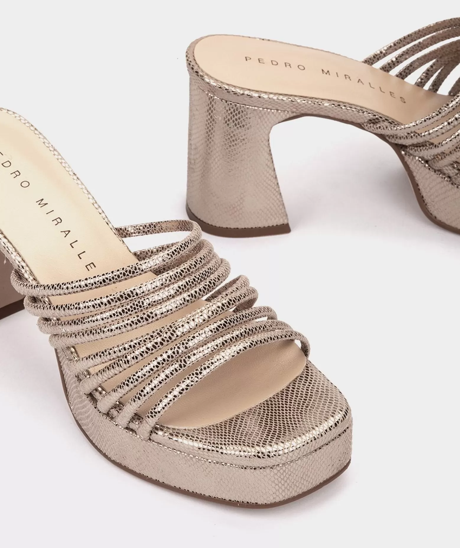 Sandales À Talon Plateforme En Cuir Métallisé Fumé. Les Multiples Brides Entrelacées Glisseront Gracieusement Sur Votre Cou De Pied, Apportant Élégance Et Confort.